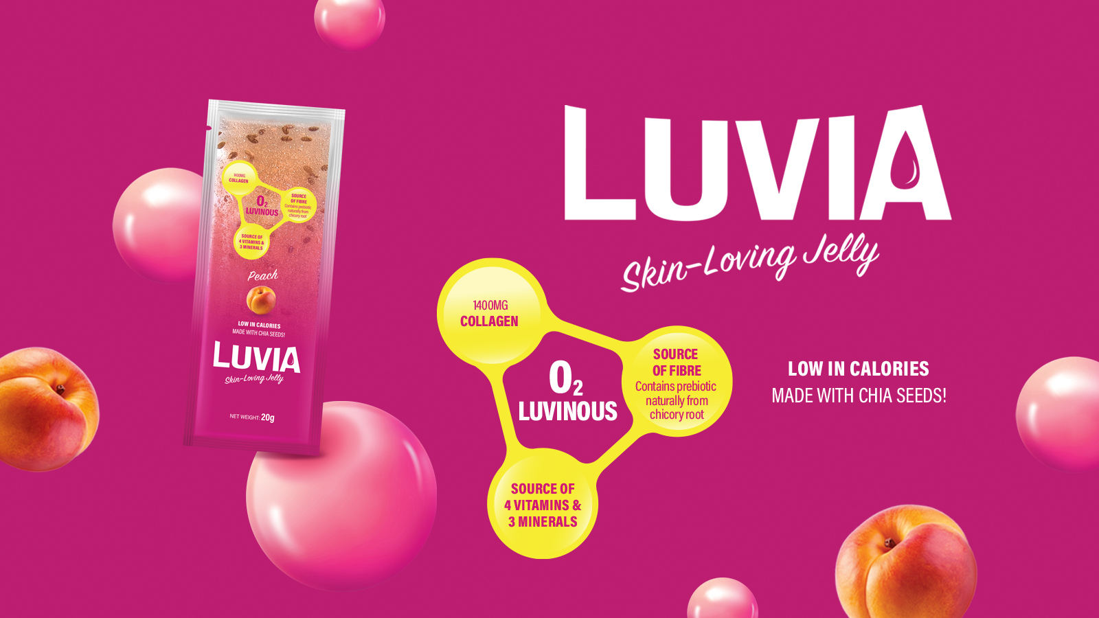 Low in calories and enriched with chia seeds, LUVIA combines collagen, prebiotic fibre from chicory root, and a blend of four vitamins and three minerals, demonstrating how manufacturers can leverage functional jelly formats to tap into the growing beauty-from-within trend.